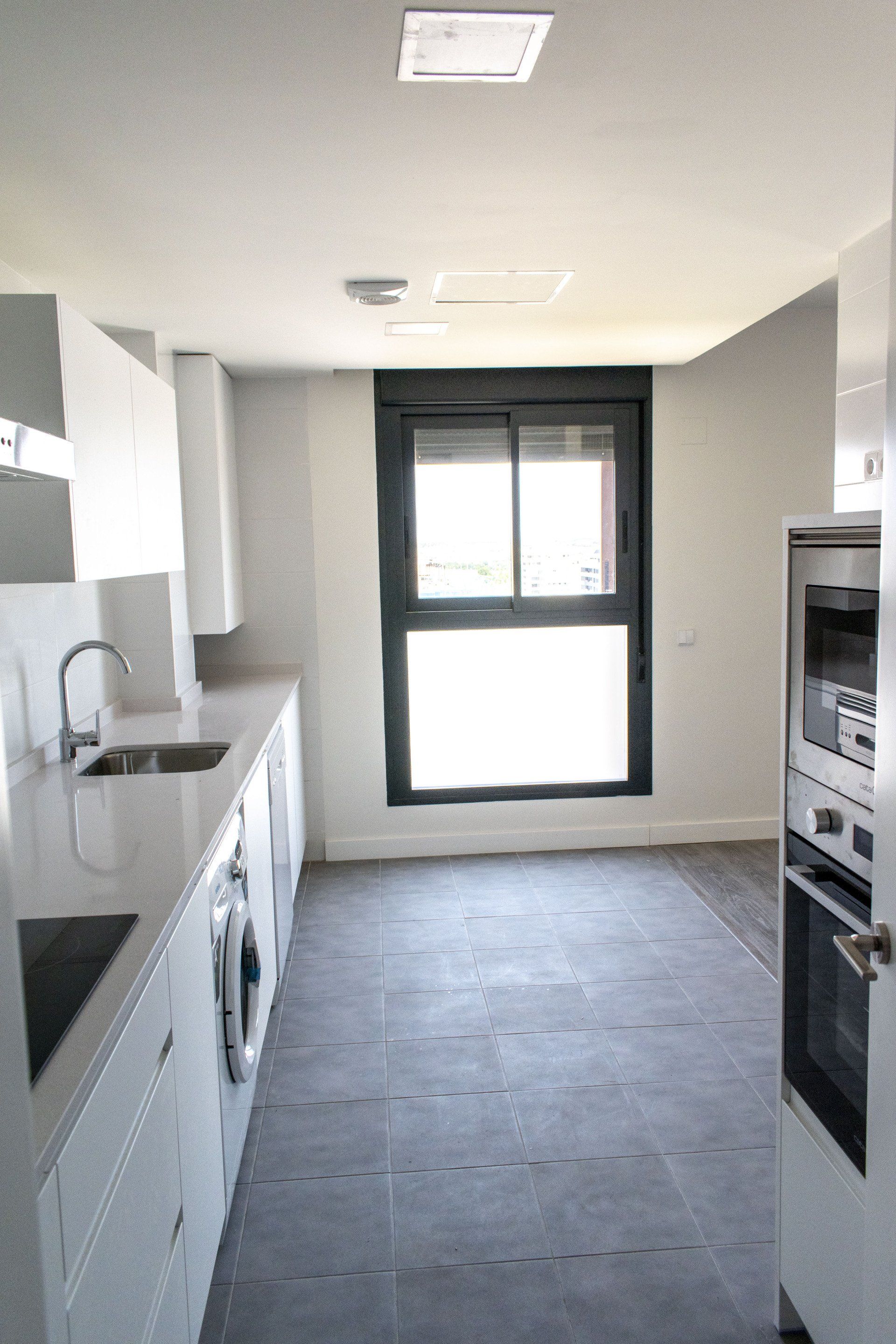 En planta Novena, dispone de un hall con un amplio armario empotrado, gran cocina de de 10m2 totalmente equipada, conecta con un espectacular salón comedor de 32 m2 y aseo.